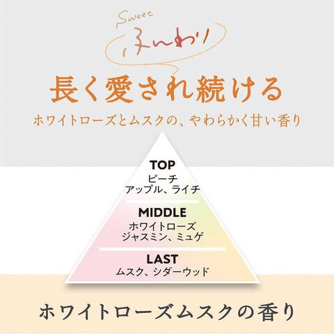 仕様2:やわらかなホワイトローズムスクの香りTOP:ピーチ、アップル、ライチMIDDOLE:ホワイトローズ、ジャスミン、ミュゲLAST:ムスク、シダーウッド