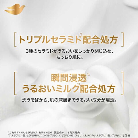 水、ラウリン酸、ミリスチン酸、水酸化K、ステアリン酸、ラウレス硫酸Na、グリセリン、ジステアリン酸グリコール、コカミドプロピルベタイン、塩化K、ヒドロキシプロピルメチルセルロース、塩化Na、グアーヒドロキシプロピルトリモニウムクロリド、香料、フェノキシエタノール、EDTA-4Na、クエン酸、ピロクトンオラミン、ヒドロキシステアリン酸、PG、ココイルグリシンK、パルミチン酸、ナイアシンアミド、セラミドNG、ワセリン、ヤシ脂肪酸K、アラキン酸、ラウロイルラクチレートNa、セラミドNP、フィトスフィンゴシン、セラミドAP、キサンタンガム、コレステロール、カルボマー、エチルヘキシルグリセリン、BHT、セラミドEOP