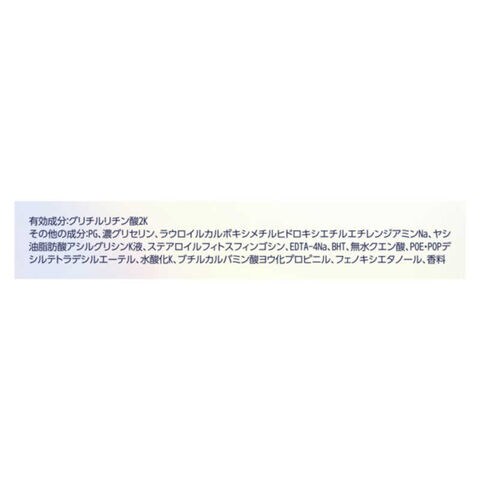 PG、濃グリセリン、ラウロイルカルボキシメチルヒドロキシエチルエチレンジアミンNa、ヤシ油脂肪酸アシルグリシンK液、ステアロイルフィトスフィンゴシン、EDTA-4Na、BHT、無水クエン酸、POE・POPデシルテトラデシルエーテル、水酸化K、ブチルカルバミン酸ヨウ化プロピニル、フェノキシエタノール、香料