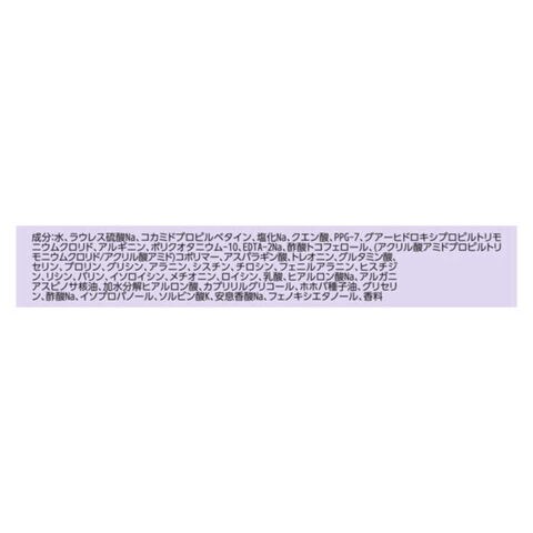 水、ラウレス硫酸Na、コカミドプロピルベタイン、塩化Na、クエン酸、PPG-7、グアーヒドロキシプロピルトリモニウムクロリド、アルギニン、ポリクオタニウム-10、EDTA-2Na、酢酸トコフェロール、(アクリル酸アミドプロピルトリモニウムクロリド/アクリル酸アミド)コポリマー、アスパラギン酸、トレオニン、グルタミン酸、セリン、プロリン、グリシン、アラニン、シスチン、チロシン、フェニルアラニン、ヒスチジン、リシン、バリン、イソロイシン、メチオニン、ロイシン、乳酸、ヒアルロン酸Na、アルガニアスピノサ核油、加水分解ヒアルロン酸、カプリリルグリコール、ホホバ種子油、グリセリン、酢酸Na、イソプロパノール、ソルビン酸K、安息香酸Na、フェノキシエタノール、香料