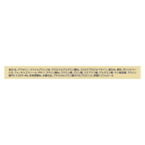 水、グリセリン、ココイルグリシンNa、ラウロイルグルタミン酸Na、コカミドプロピルベタイン、塩化Na、香料、ポリソルベート20、フェノキシエタノール、PPG-7、ラウリン酸Na、ラウリン酸、クエン酸、ステアリン酸、グルタミン酸、ヤシ脂肪酸、ラウリン酸PEG-4、EDTA-4Na、安息香酸Na、水酸化Na、ブチルカルバミン酸ヨウ化プロピニル、酢酸トコフェロール