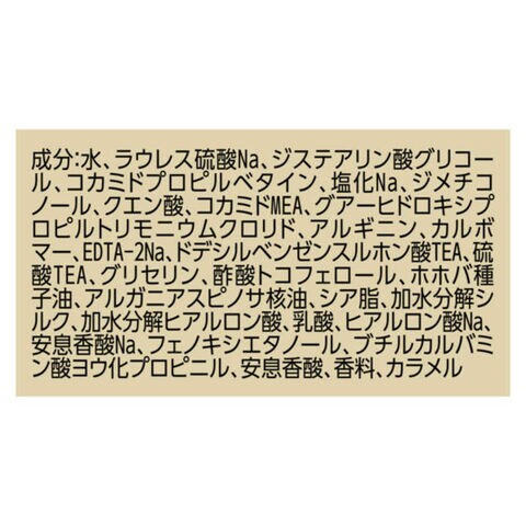 水、ラウレス硫酸Na、ジステアリン酸グリコール、コカミドプロピルベタイン、塩化Na、ジメチコノール、クエン酸、コカミドMEA、グアーヒドロキシプロピルトリモニウムクロリド、アルギニン、カルボマー、EDTA-2Na、ドデシルベンゼンスルホン酸TEA、硫酸TEA、グリセリン、酢酸トコフェロール、ホホバ種子油、アルガニアスピノサ核油、シア脂、加水分解シルク、加水分解ヒアルロン酸、乳酸、ヒアルロン酸Na、安息香酸Na、フェノキシエタノール、ブチルカルバミン酸ヨウ化プロピニル、安息香酸、香料、カラメル