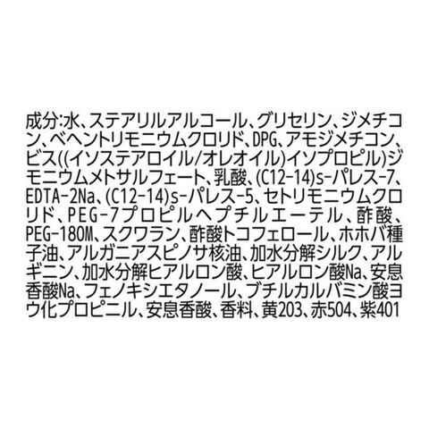 水、ステアリルアルコール、グリセリン、ジメチコン、ベヘントリモニウムクロリド、DPG、アモジメチコン、ビス((イソステアロイル/オレオイル)イソプロピル)ジモニウムメトサルフェート、乳酸、(C12-14)s-パレス-7、EDTA-2Na、(C12-14)s-パレス-5、セトリモニウムクロリド、PEG-7プロピルヘプチルエーテル、酢酸、PEG-180M、スクワラン、酢酸トコフェロール、ホホバ種子油、アルガニアスピノサ核油、加水分解シルク、アルギニン、加水分解ヒアルロン酸、ヒアルロン酸Na、安息香酸Na、フェノキシエタノール、ブチルカルバミン酸ヨウ化プロピニル、安息香酸、香料、黄203、赤504、紫401