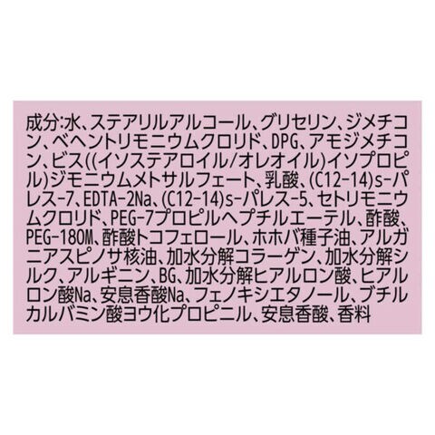 水、ステアリルアルコール、グリセリン、ジメチコン、ベヘントリモニウムクロリド、DPG、アモジメチコン、ビス((イソステアロイル/オレオイル)イソプロピル)ジモニウムメトサルフェート、乳酸、(C12-14)s-パレス-7、EDTA-2Na、(C12-14)s-パレス-5、セトリモニウムクロリド、PEG-7プロピルヘプチルエーテル、酢酸、PEG-180M、酢酸トコフェロール、ホホバ種子油、アルガニアスピノサ核油、加水分解コラーゲン、加水分解シルク、アルギニン、BG、加水分解ヒアルロン酸、ヒアルロン酸Na、安息香酸Na、フェノキシエタノール、ブチルカルバミン酸ヨウ化プロピニル、安息香酸、香料
