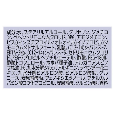 水、ステアリルアルコール、グリセリン、ジメチコン、ベヘントリモニウムクロリド、DPG、アモジメチコン、ビス((イソステアロイル/オレオイル)イソプロピル)ジモニウムメトサルフェート、乳酸、(C12-14)s-パレス-7、EDTA-2Na、(C12-14)s-パレス-5、セトリモニウムクロリド、PEG-7プロピルヘプチルエーテル、酢酸、PEG-180M、酢酸トコフェロール、ホホバ種子油、アルガニアスピノサ核油、PG、加水分解シルク、アルギニン、ラベンダー花エキス、加水分解ヒアルロン酸、ヒアルロン酸Na、グルコース、安息香酸Na、フェノキシエタノール、ブチルカルバミン酸ヨウ化プロピニル、安息香酸、ソルビン酸K、香料