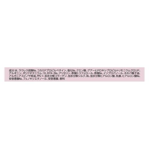 水、ラウレス硫酸Na、コカミドプロピルベタイン、塩化Na、クエン酸、グアーヒドロキシプロピルトリモニウムクロリド、アルギニン、ポリクオタニウム-10、EDTA-2Na、グリセリン、酢酸トコフェロール、酢酸Na、イソプロパノール、ホホバ種子油、アルガニアスピノサ核油、PPG-7、加水分解コラーゲン、加水分解シルク、BG、加水分解ヒアルロン酸、乳酸、ヒアルロン酸Na、安息香酸Na、フェノキシエタノール、安息香酸、香料
