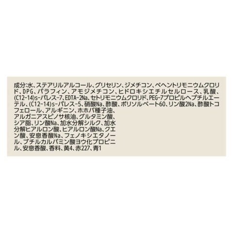 水、ステアリルアルコール、グリセリン、ジメチコン、ベヘントリモニウムクロリド、DPG、パラフィン、アモジメチコン、ヒドロキシエチルセルロース、乳酸、(C12-14)s-パレス-7、EDTA-2Na、セトリモニウムクロリド、PEG-7プロピルヘプチルエーテル、(C12-14)s-パレス-5、硝酸Na、酢酸、ポリソルベート60、リン酸2Na、酢酸トコフェロール、アルギニン、ホホバ種子油、アルガニアスピノサ核油、グルタミン酸、シア脂、リン酸Na、加水分解シルク、加水分解ヒアルロン酸、ヒアルロン酸Na、クエン酸、安息香酸Na、フェノキシエタノール、ブチルカルバミン酸ヨウ化プロピニル、安息香酸、香料、黄4、赤227、青1
