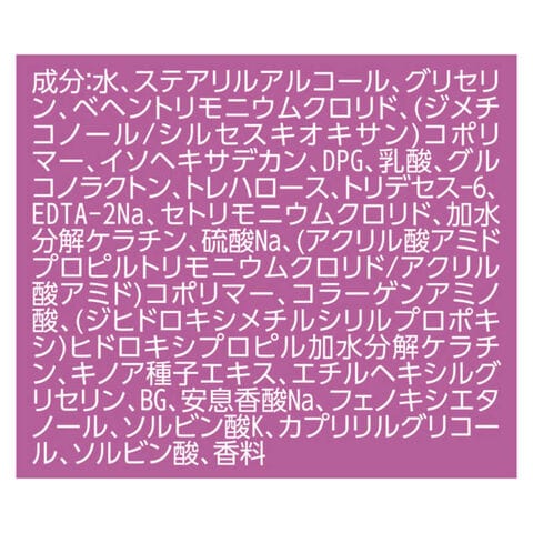 水、ステアリルアルコール、グリセリン、ベヘントリモニウムクロリド、(ジメチコノール/シルセスキオキサン)コポリマー、イソヘキサデカン、DPG、乳酸、グルコノラクトン、トレハロース、トリデセス-6、EDTA-2Na、セトリモニウムクロリド、加水分解ケラチン、硫酸Na、(アクリル酸アミドプロピルトリモニウムクロリド/アクリル酸アミド)コポリマー、コラーゲンアミノ酸、(ジヒドロキシメチルシリルプロポキシ)ヒドロキシプロピル加水分解ケラチン、キノア種子エキス、エチルヘキシルグリセリン、BG、安息香酸Na、フェノキシエタノール、ソルビン酸K、カプリリルグリコール、ソルビン酸、香料