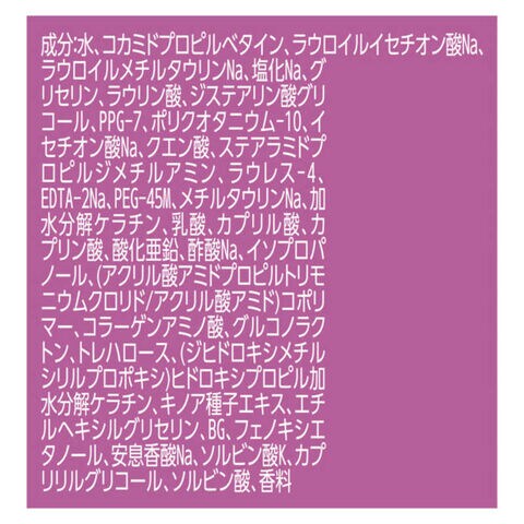 水、コカミドプロピルベタイン、ラウロイルイセチオン酸Na、ラウロイルメチルタウリンNa、塩化Na、グリセリン、ラウリン酸、ジステアリン酸グリコール、PPG-7、ポリクオタニウム-10、イセチオン酸Na、クエン酸、ステアラミドプロピルジメチルアミン、ラウレス-4、EDTA-2Na、PEG-45M、メチルタウリンNa、加水分解ケラチン、乳酸、カプリル酸、カプリン酸、酸化亜鉛、酢酸Na、イソプロパノール、(アクリル酸アミドプロピルトリモニウムクロリド/アクリル酸アミド)コポリマー、コラーゲンアミノ酸、グルコノラクトン、トレハロース、(ジヒドロキシメチルシリルプロポキシ)ヒドロキシプロピル加水分解ケラチン、キノア種子エキス、エチルヘキシルグリセリン、BG、フェノキシエタノール、安息香酸Na、ソルビン酸K、カプリリルグリコール、ソルビン酸、香料