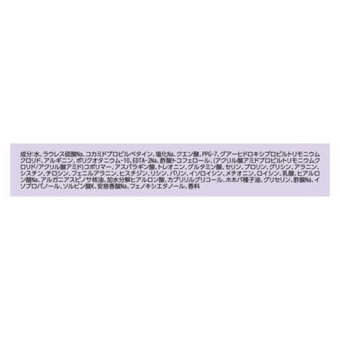 水、ラウレス硫酸Na、コカミドプロピルベタイン、塩化Na、クエン酸、PPG-7、グアーヒドロキシプロピルトリモニウムクロリド、アルギニン、ポリクオタニウム-10、EDTA-2Na、酢酸トコフェロール、(アクリル酸アミドプロピルトリモニウムクロリド/アクリル酸アミド)コポリマー、アスパラギン酸、トレオニン、グルタミン酸、セリン、プロリン、グリシン、アラニン、シスチン、チロシン、フェニルアラニン、ヒスチジン、リシン、バリン、イソロイシン、メチオニン、ロイシン、乳酸、ヒアルロン酸Na、アルガニアスピノサ核油、加水分解ヒアルロン酸、カプリリルグリコール、ホホバ種子油、グリセリン、酢酸Na、イソプロパノール、ソルビン酸K、安息香酸Na、フェノキシエタノール、香料