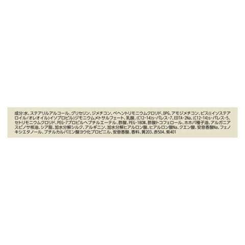 水、ステアリルアルコール、グリセリン、ジメチコン、ベヘントリモニウムクロリド、DPG、アモジメチコン、ビス((イソステアロイル/オレオイル)イソプロピル)ジモニウムメトサルフェート、乳酸、(C12-14)s-パレス-7、EDTA-2Na、(C12-14)s-パレス-5、セトリモニウムクロリド、PEG-7プロピルヘプチルエーテル、酢酸、PEG-180M、酢酸トコフェロール、ホホバ種子油、アルガニアスピノサ核油、シア脂、加水分解シルク、アルギニン、加水分解ヒアルロン酸、ヒアルロン酸Na、クエン酸、安息香酸Na、フェノキシエタノール、ブチルカルバミン酸ヨウ化プロピニル、安息香酸、香料、黄203、赤504、紫401
