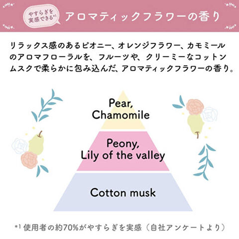 仕様2:着色料・シリコン 無添加アロマティックフラワーの香りTOP:Pear、ChamomileMIDDOLE:Peony、Lily of the valleyLAST:Cotton musk
