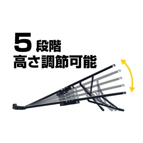 5段階の角度調節が可能で、ノートパソコンの画面を自分の目線に合わせることで姿勢を直し、肩こりや腰の負担軽減になります。