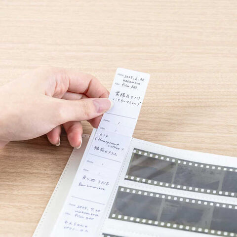 ●各ページに、撮影日・使用フィルムのメモができるカード付きなので、ネガフィルムの整理に便利です。