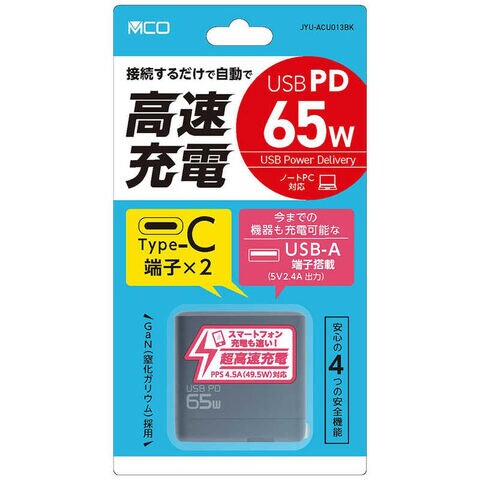 ナカバヤシ AC-USB充電器 ノートパソコン・タブレットPC対応 65W [3ポート:USB-Cx2+USB-A / USB Power Delivery対応] ブラック JYU-ACU013BK