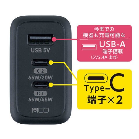 Type-Cポート単体使用時はそれぞれ最大65W(20V3.25A)での充電に対応。