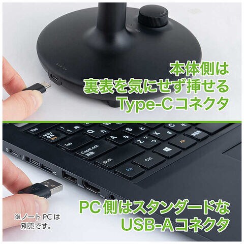 USB-Aポート接続で動作しますのでノートPCだけでなく、別売りのUSBACアダプタと組み合わせても使用可能です。