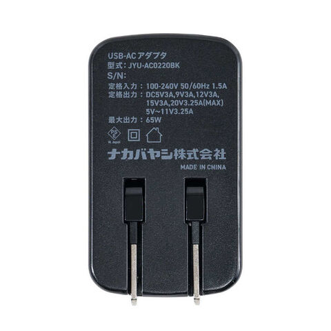 仕様1:[対応機種]PD充電に対応したスマートフォン・タブレット、パソコン、ゲーム機、モバイルバッテリーなど[インターフェイス]Type-C(オス)x1[ケーブル長]約2m[規格]USB PowerDelivery 3.0[本体寸法]約W32xH54xD54mm[重量]163g(ケーブル込み)[入力(INPUT)]100V-240V 50/60Hz 1.5A[出力(OUTPUT)]5V3A、 9V3A、12V3A、15V3A、 20V3.25A、 5~11V3.25A (65W Max)