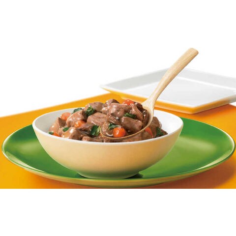 愛犬の大好きな旨みたっぷりのビーフに、ビタミン豊富な緑黄色野菜をおいしいスープで仕上げました。