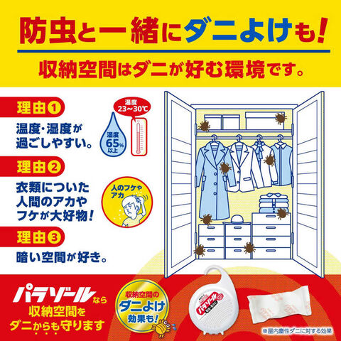●せんいの防虫に加え、気になるダニを収納空間内に寄せつけにくくします。