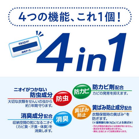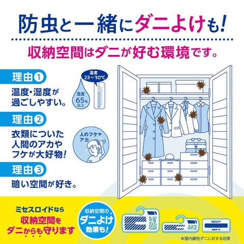 ●せんいの防虫に加え、気になるダニを収納空間内に寄せつけにくくします。