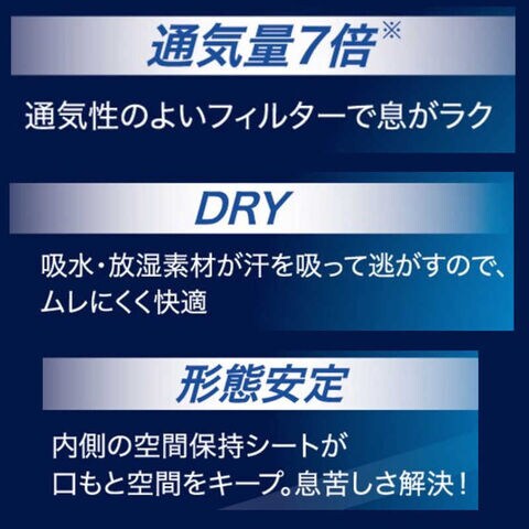 抜群の息のしやすさと軽いつけ心地。通気量7倍(メーカー比)のフィルターで息がラク。