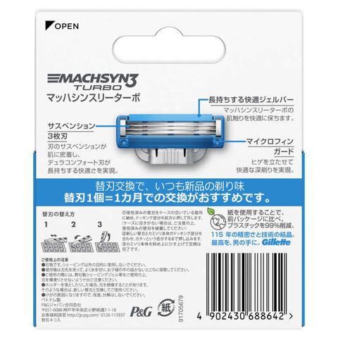 高性能3枚刃髭剃り、ジレット マッハシンスリー ターボ用替刃。 外科用メスよりも薄い刃を採用し、従来よりもさらに深剃りが可能に。 アンチフリクションコーティング加工が施されているため、肌への刺激も軽減します。