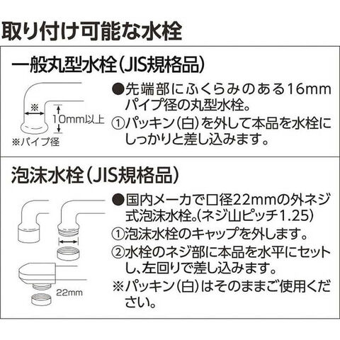 仕様2:対応水栓:一般水栓パイプ径16mm/泡沫水栓外ネジ22mm ※先端部のキャップ(泡沫水栓)を外して取り付けてください。