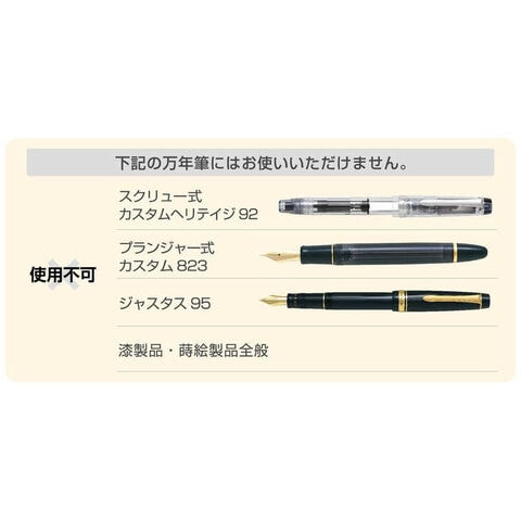 ※漆製品(蒔絵品を含む)、吸入専用万年筆(S式・P式)、ジャスタス95にはご使用いただけません。