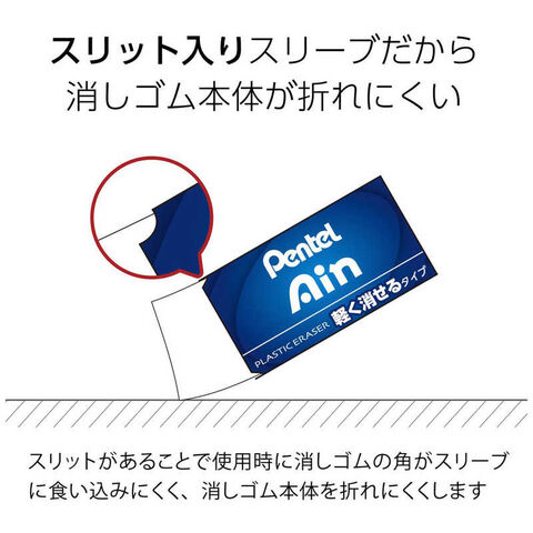 〈軽く消せるタイプ〉少ない消しくずで机を汚さず、軽い力で楽に消せます。
