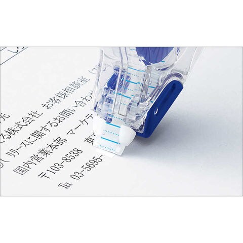 修正テープのカートリッジフィルムに、実線と点線のブルーラインが約2mm間隔で繰り返し付いています。