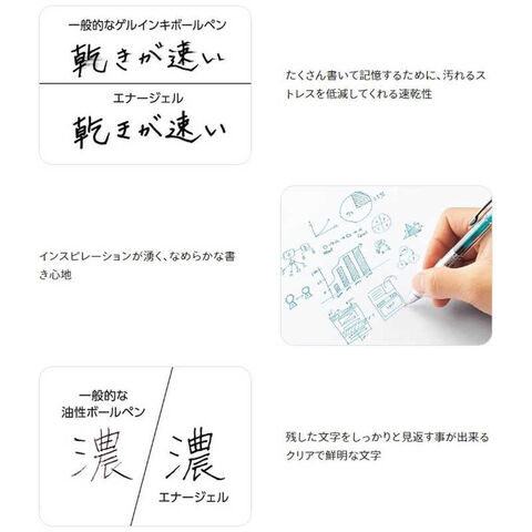なめらかな書き味、鮮明な筆跡、速乾性が特長のエナージェルインキ採用。