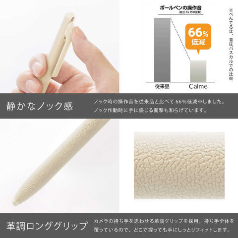 静かな室内(図書館・自習室・コワーキングスペースなど)で使用しても周囲への音の影響が少ない「静音設計」の油性ボールペンです。