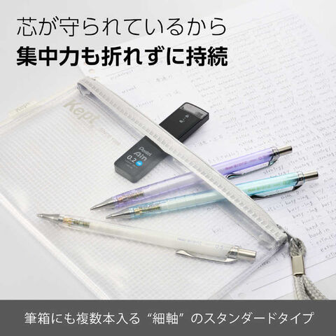 ペン先のパイプが芯の減りに合わせて一緒にスライドすることで、芯が常にパイプで守られた状態で筆記ができるため、芯が折れません。