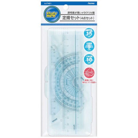 仕様1:本体サイズ:W72 × H165 × D10mm(PPハードケース入)本体重量:61g(包装資材含む)素材:定規=アクリル製(メタクリル樹脂)セット内容: 直定規(15cm)三角定規(10cm)分度器(9cm)