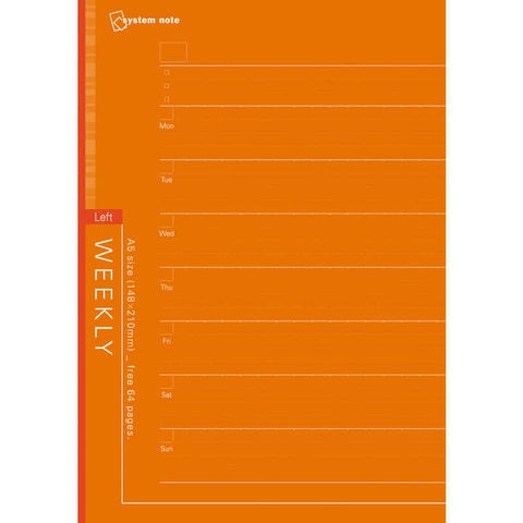 仕様1:A5サイズサイズ / 重量:W148 x H210 x D4mm / 100gページ数:64ページ仕様:日付なし、片面1週間+ドット方眼ノート