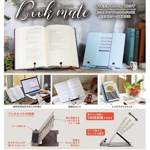 仕様1:[本の厚さ]25mm以内本体サイズ:W175 × H210 × D11mm(折りたたみ時)本体重量:330g(包装資材含まず)素材:スチール角度調節:5段階