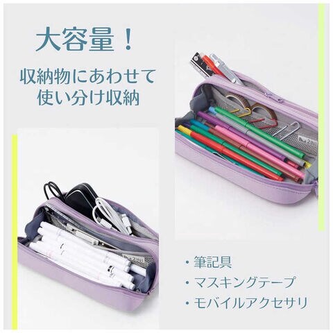 筆記具と一緒にイヤホンや充電ケーブルなどを仕分けて収納できる便利なペンケースです。
