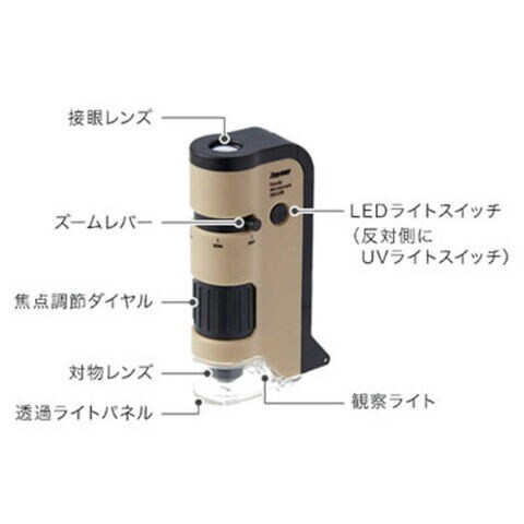 仕様1:■本体サイズ:W62.7×H112.2×D30mm■本体重量:70g(電池を含まず)■素材(本体・スマホアダプター):ABS/(レンズ):アクリル/(レンズカバー・透過ライトパネル):PC/(プレパラート):PC■使用電池:単三形乾電池×1本(別売り)■付属品:ハンドストラップ、スマホアダプター、プレパラート(玉ねぎの皮)、スライドガラス、カバーガラス■連続点灯時間:約24時間