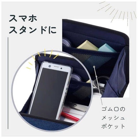 内側には、付箋などを入れられるメッシュポケット付きで、スマートフォンを立てることもできます。