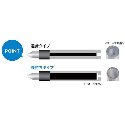 ●最もよく使う黒インクには、リフィルチューブを肉薄化することで通常品に比べインク量を約70%増量した「長持ちリフィル」を搭載しています。
