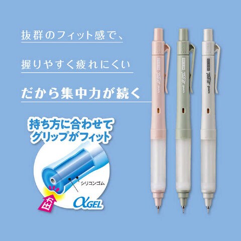 グリップ部に、衝撃吸収アルファゲルを使うことにより、筆記中も指の疲れを軽減し、集中力が継続します。