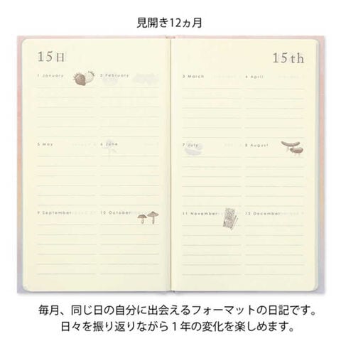 見開き2ページの中で、同じ日付を12ヵ月分書き込む日記です。日々を振り返りながら1年の変化が楽しめるフォーマットになっています。