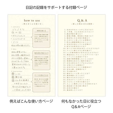 書くことが思い浮かばない時に役立つ「Q&A」や豊富な書き見本など、書き方をサポートする付録ページも充実しているので、連用日記初心者の方にもおすすめの1冊です。