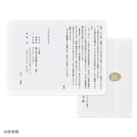 会社設立、事務所移転などのビジネスシーンや結婚式、法要などのパーソナルシーンなど、あらゆる場面で使用できる挨拶状・案内状セットです。