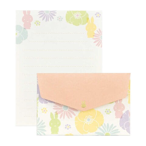 さわやかなパステル色の花柄と、封筒に施した箔押しエンボス加工のミッフィーがポイント。