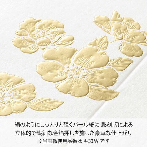 絹のようにしっとりと輝くパール紙に彫刻版による立体的で繊細な金箔押しを施した豪華な仕上がりです。