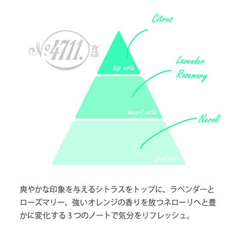 爽やかな印象を与えるシトラスをトップに、甘くクリアなフローラル、そして快いオレンジへと豊かに変化する3つのノート。
