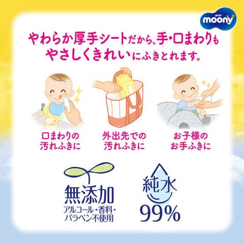 やわらか厚手シートで、赤ちゃんの手・口まわりの汚れも、安心してやさしくキレイにふいてあげられます。