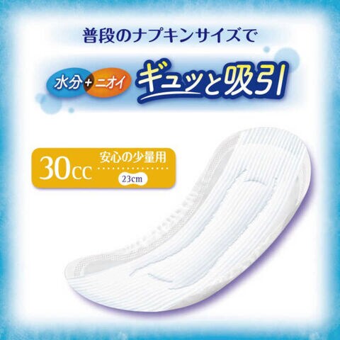 ●高吸収ポリマーとなみなみシートで瞬間吸収し、表面に残る間もなく、お肌サラサラ。また消臭ポリマーと吸着カプセルのダブルニオイ吸着システムで24時間消臭長続き。だから尿もれを気にせず、普段通り過ごせます。